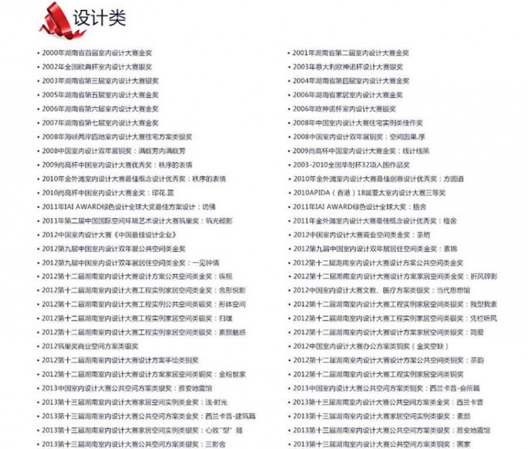 歷次“華耐杯中國室內設計大賽”湖南地區(qū)最高獎,2013中國室內設計大賽公共空間方案類銀獎及銅獎、第十三屆湖南室內設計大賽公共空間及家居空間實例類金獎、銀獎、銅獎、優(yōu)秀獎等,2012中國室內設計大賽“中國最佳設計企業(yè)”及商業(yè)空間類金獎、第九屆中國室內設計雙年展公共空間類金獎及居住空間類金獎、中國室內設計大賽文教、醫(yī)療方案類銀獎、第十二屆湖南室內設計大賽設計方案公共空間類金獎、銀獎及家居空間類金獎、銀獎等,2011年IAI AWARD綠色設計全球“最佳方案設計獎”、第二屆中國國際空間環(huán)境藝術設計大賽筑巢獎、金外灘室內設計大賽最佳概念設計優(yōu)秀獎,2010年金外灘獎“最佳創(chuàng)新設計獎”和“最佳概念設計獎”、尚高杯中國室內設計大賽金獎、APIDA(香港)18屆亞太室內設計大賽三等獎,2009年“中國室內設計大賽唯一實例類金獎”,2006年“海峽兩岸四地室內設計銅獎”、“IFI國際設計大賽銅獎”、2006年“首屆歐神諾杯設計大賽”金、銀獎,包攬2000—2006年六屆“湖南室內設計大賽”金獎,2003年“意大利歐神諾杯設計大賽”銀獎、“迅達杯設計大賽”金獎,2002年“全國歐典杯室內設計大賽”銀獎、“湖南環(huán)保時尚設計大賽”金獎。