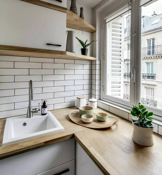 木材自然的紋理,偏向暖色調(diào)的色澤,讓你的廚房臺面獨(dú)一無二,木材容易切割,適合造型不規(guī)則的廚房空間。
