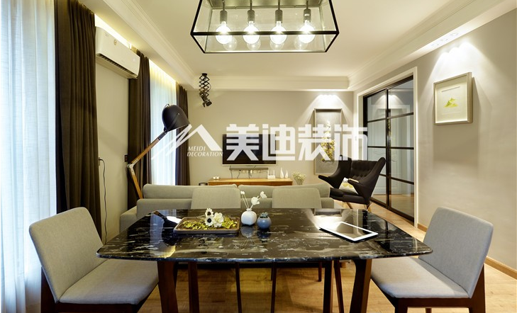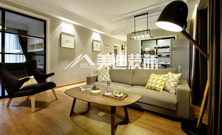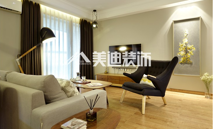 ▲ 南北朝向加上大大的落地窗,良好的采光也可能帶來(lái)困擾。因而設(shè)計(jì)師為客廳設(shè)計(jì)了麻布+沙的雙層窗簾,這樣即使遇到陽(yáng)光強(qiáng)烈的晴天,拉上紗簾,光線也會(huì)立刻變得柔和。