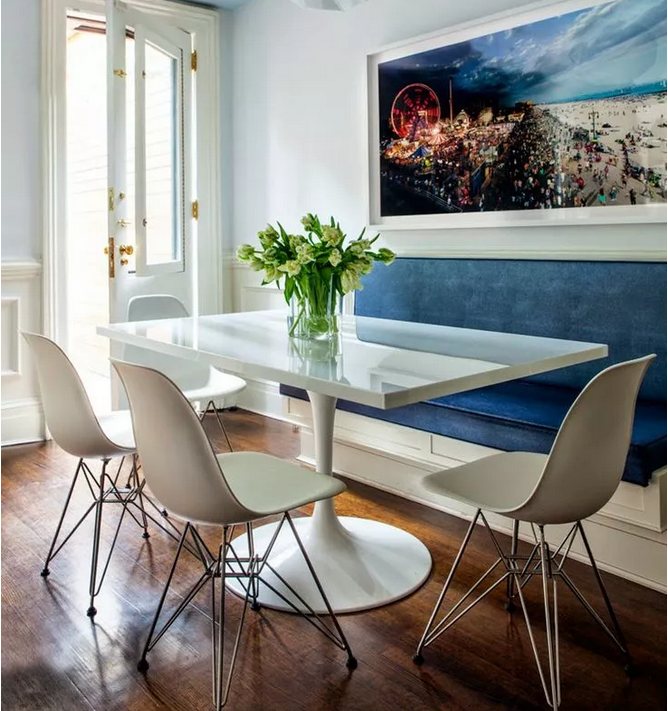 這種卡座依墻而設,是裝修中最為常見的形式,直線型結構既簡單又節(jié)省空間。搭配座椅使用,相對來說比較靈活。所以,適合大部分家庭。
