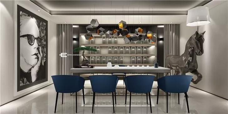 茶室:精巧的茗茶空間中那時尚的墻畫、個性不規(guī)則吊燈等,每個物件都發(fā)出著他對時尚界的追捕訊號。