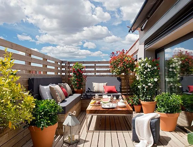 在露臺(tái)上安裝棚架也是不錯(cuò)的選擇,有保護(hù)私密、遮風(fēng)擋雨、為植物提供生長空間的作用。安裝時(shí)需考慮其抗風(fēng)穩(wěn)固性。