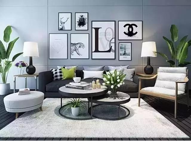 墻上的掛畫和整個客廳的色調(diào)一樣,黑白灰三種顏色,最經(jīng)典的搭配。