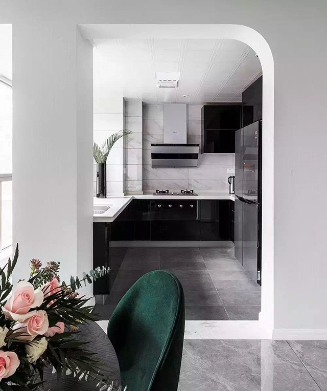 廚房是女主人最喜歡的地方。當然正方形的廚房也是可以設(shè)計成L型的櫥柜的,這樣活動空間會更多一些,平時可以夫妻倆一起做飯、非常溫馨。