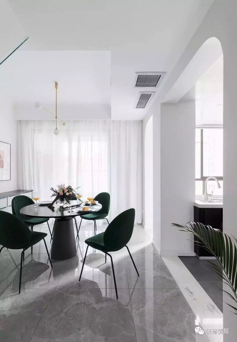 三棱錐形的壁燈,祖母綠的甲殼蟲餐椅搭配立柱黑色圓桌,有種高貴的感覺。餐廳雖然在樓梯底部,但絲毫也不影響采光。