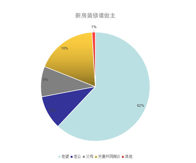 根據(jù)調(diào)查結(jié)果顯示,超過60%的家庭在裝修的時(shí)候由老婆做主,18%的家庭選擇夫妻共同商議,9%的家庭選擇聽父母的意見。