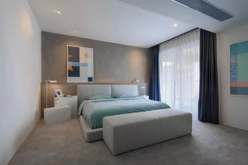 床頭背景除了大白墻之外,可以用彩色乳膠漆或者其他各種材料做立面造型,只要搭配得當,各種材料都可以發(fā)揮出很不錯的效果。