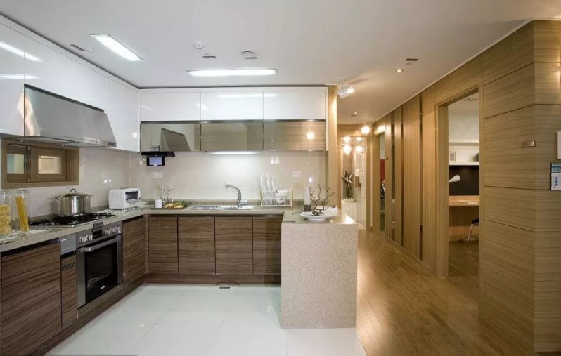 廚房和客廳的交界處,一般客廳會(huì)比廚房高出1cm,防止廚房的水流進(jìn)客廳,如果是地磚,一定要把弧度磨成45°角,首先是美觀,最重要的是可以防止走路被絆倒。