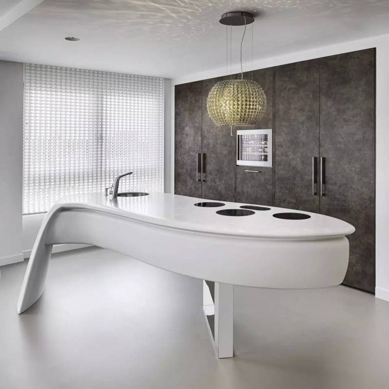 吧臺的不規(guī)則立面,無拉手設(shè)計(jì),線條優(yōu)美,貼合指尖曲線躍動(dòng)自然。