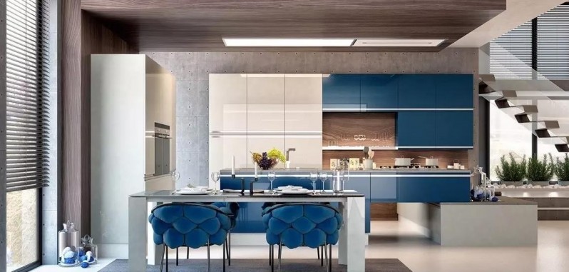 清淺的藍(lán)色和白色構(gòu)置的廚房空間清新十足,空曠的開放式餐廚設(shè)計(jì),空間現(xiàn)代風(fēng)氣質(zhì)十足。