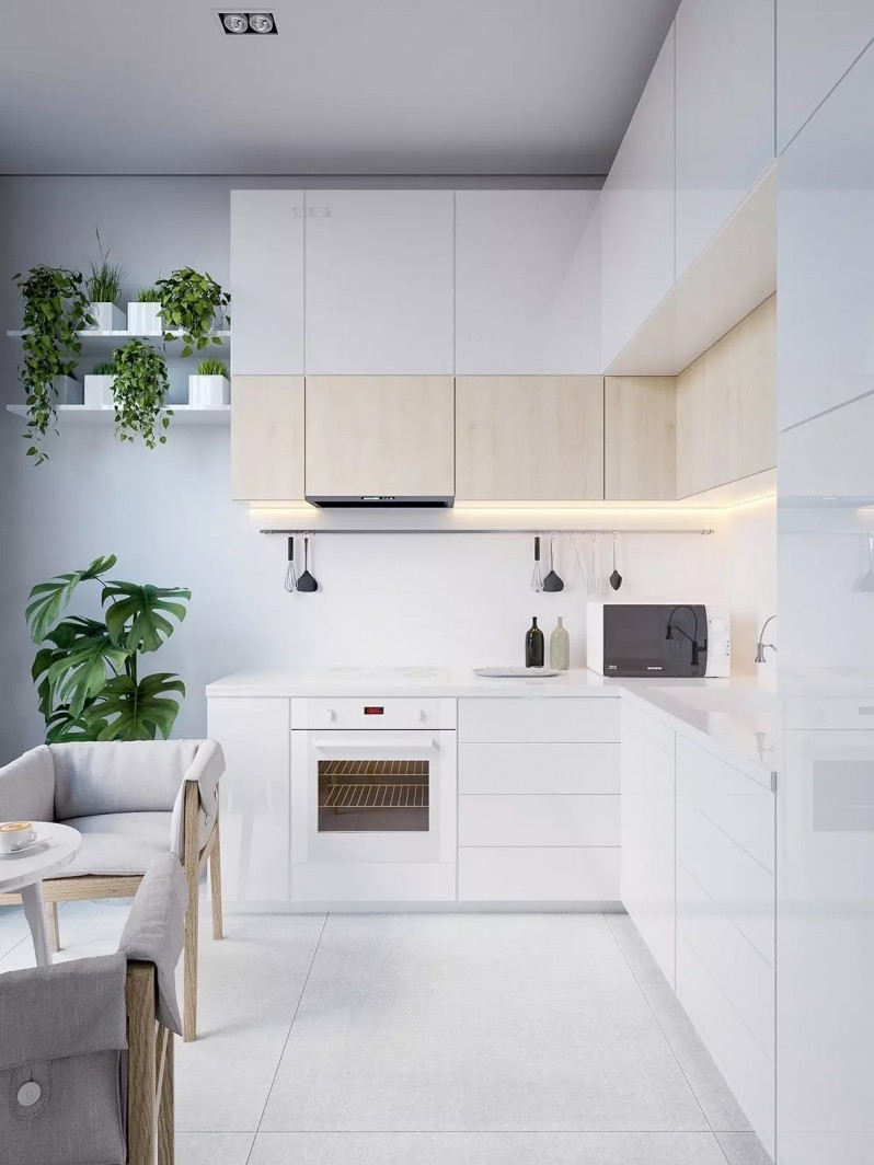 白色還是白色,但是不做裸墻,混搭式的柜體設(shè)計(jì),再配上一小節(jié)的瓷磚,讓廚房更小清新,烹飪者的心情怎么會差呢?