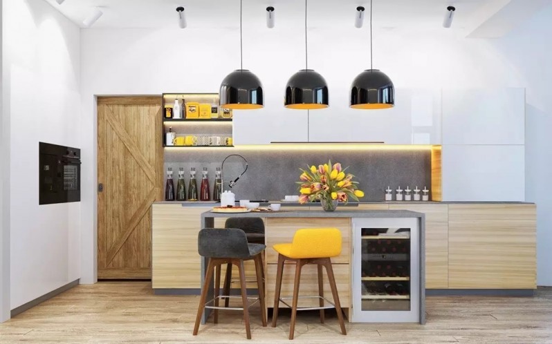 白+原木+黃色櫥柜搭配簡約、時(shí)尚風(fēng)格的鏗固門窗,頗有歐式風(fēng)情,整體效果很大氣,再加上造型獨(dú)特的吊燈,讓廚房設(shè)計(jì)簡約又不失個(gè)性。