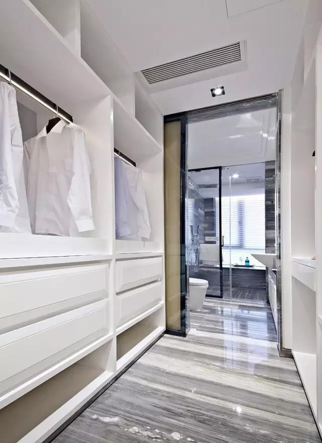 主衛(wèi)的通道,甚至是衛(wèi)生間原本的干區(qū),都可以改造利用起來,把主衛(wèi)門外的兩側(cè)裝成步入式衣帽間,這樣利用也是不錯的選擇。