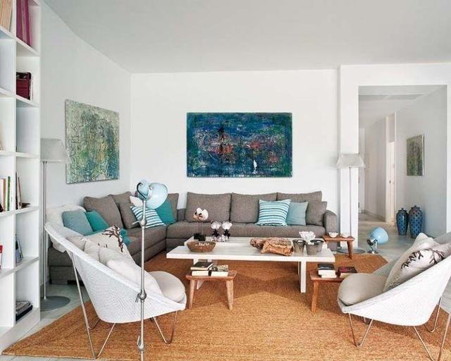 上面的例子就是一個(gè)以會(huì)客為中心的客廳設(shè)計(jì),簡(jiǎn)潔清爽。視覺(jué)中心是墻上的掛畫(huà)。
