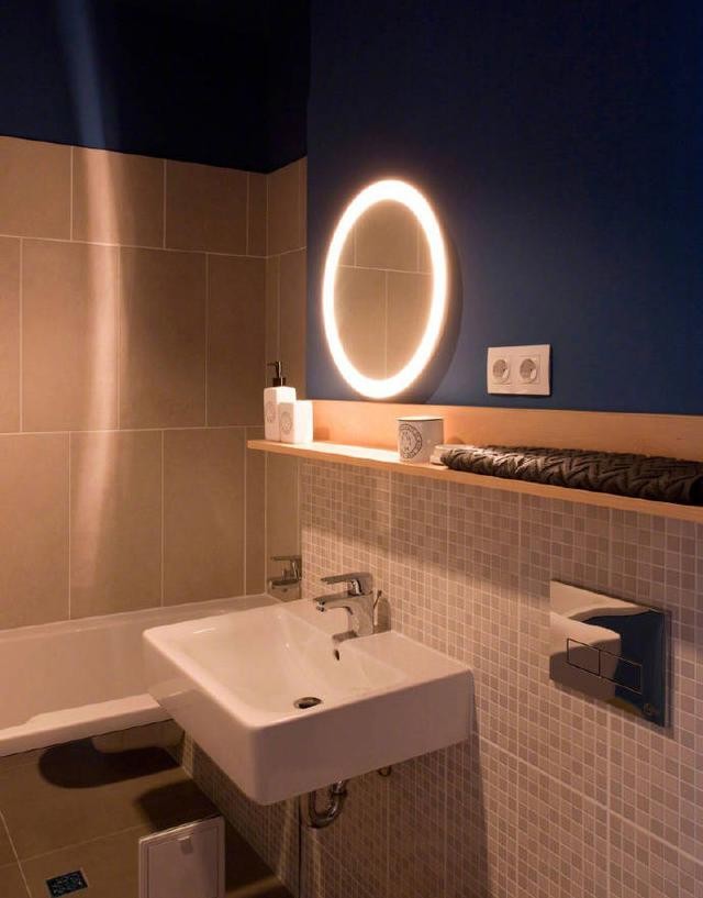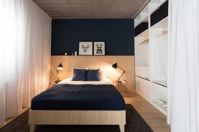 廚房的墻面還是采用大面積的深藍,櫥柜等設(shè)計都是極簡