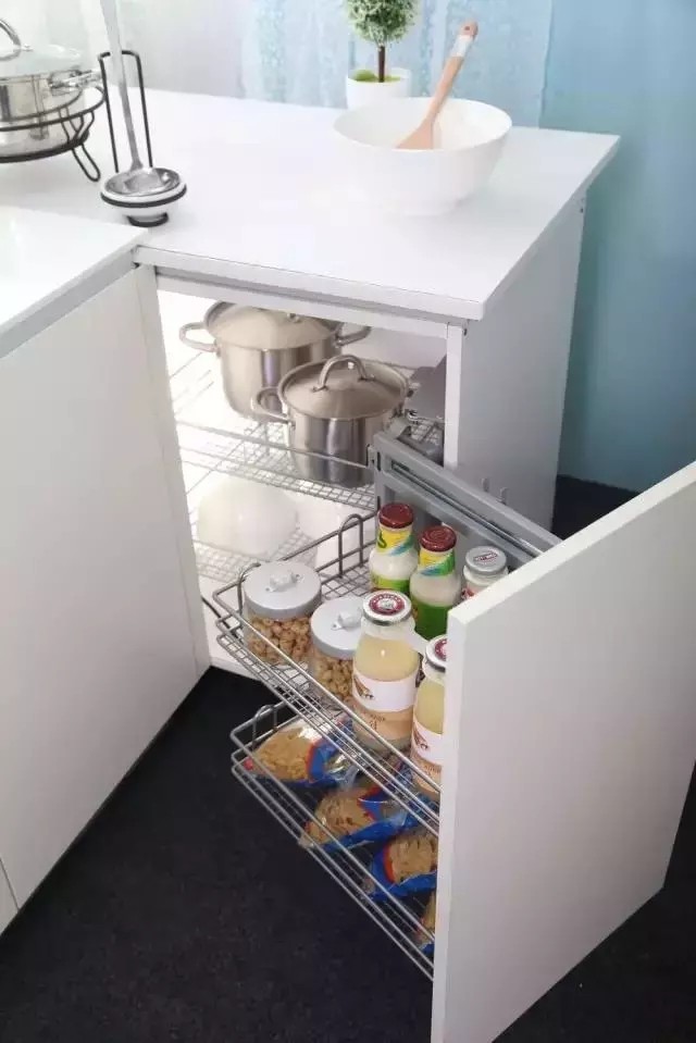 轉(zhuǎn)角拉籃絕對是個好東西,瀝水方便,拿取也方便,很多人做成抽屜放碗碟,時間長了長期接觸水漬,肯定會發(fā)霉。