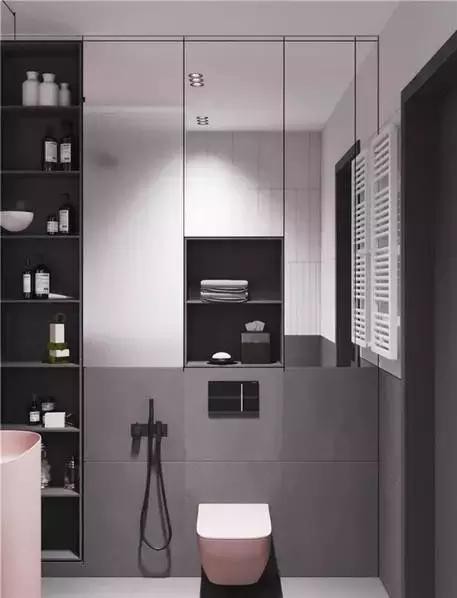 衛(wèi)生間回到了經典黑白灰基調中,加入稍許粉色點綴。半墻的鏡子讓小空間看上去更大,也能作為穿衣鏡、化妝鏡使用。