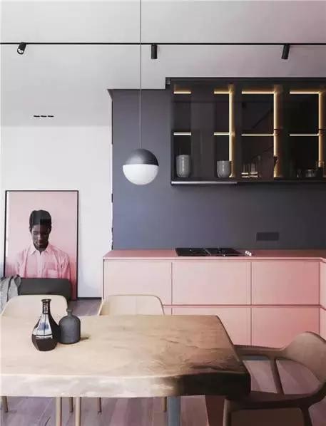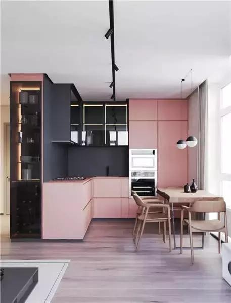 廚房是粉色與黑灰色為主色調,吊柜內加入燈帶設計,再用黑色的射燈來渲染氛圍,展現出一個時尚脫俗的廚房空間,讓人忍不住想多逗留幾分。