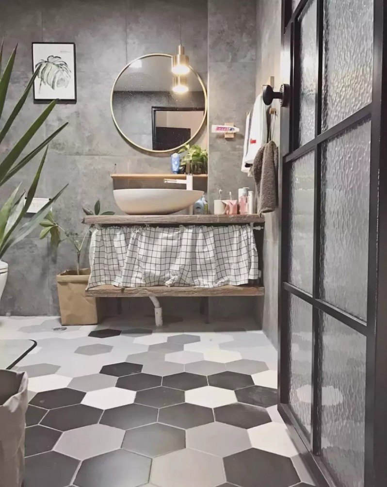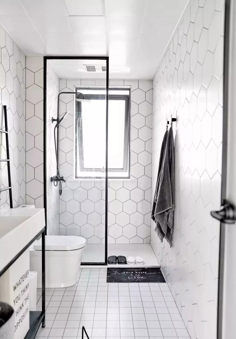 衛(wèi)生間的空間小功能單調(diào),很容易裝成枯燥無(wú)味的格調(diào),而加入一些文藝的六邊磚,整體空間格調(diào)就全然不同了;