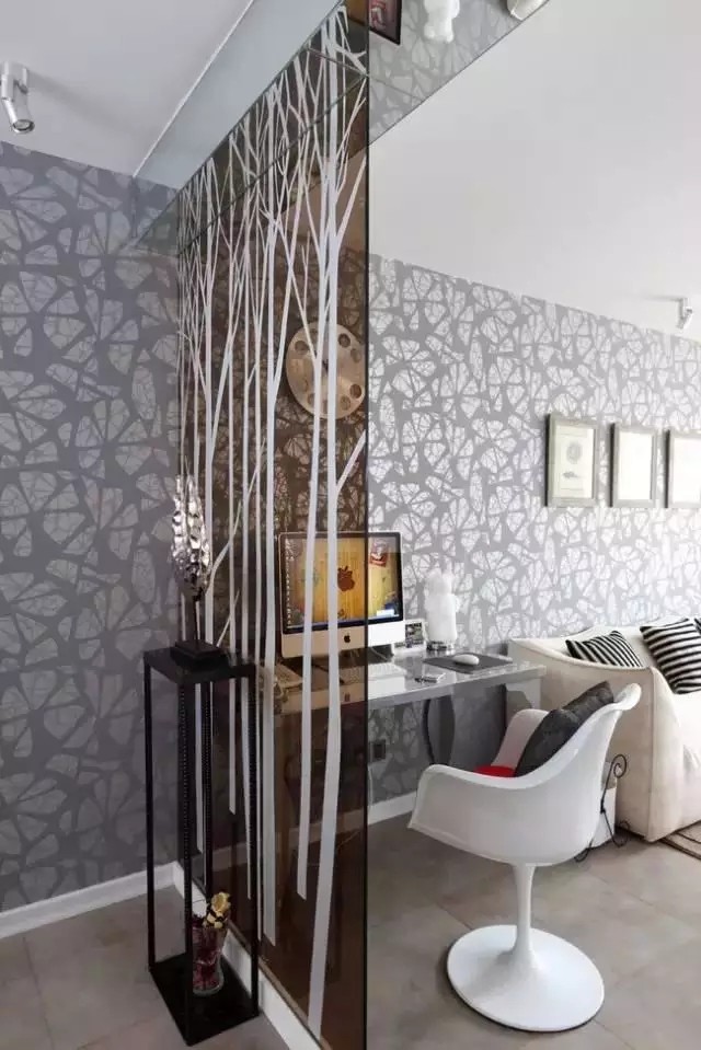 是以大屏玻璃作裝飾遮隔,或在夾板貼面旁嵌飾噴砂玻璃、壓花玻璃等通透的材料,既可以分隔大空間,又能保持整體空間的完整性。