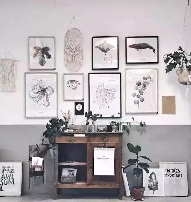▲ 高級灰上墻,這個墻裙很高級?;顫姷目臻g和耐臟的墻壁,魚與熊掌兼得。白墻是豐富的掛畫,灰墻是櫥柜綠植,分割鮮明。