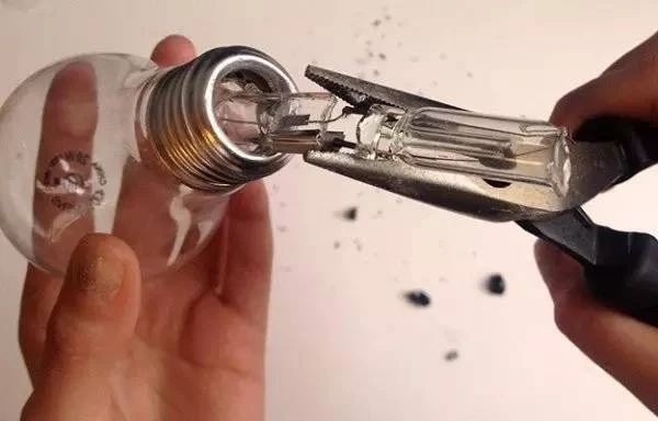 1、用老虎鉗把燈泡尾部連接燈絲的地方捏碎