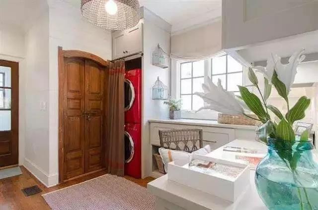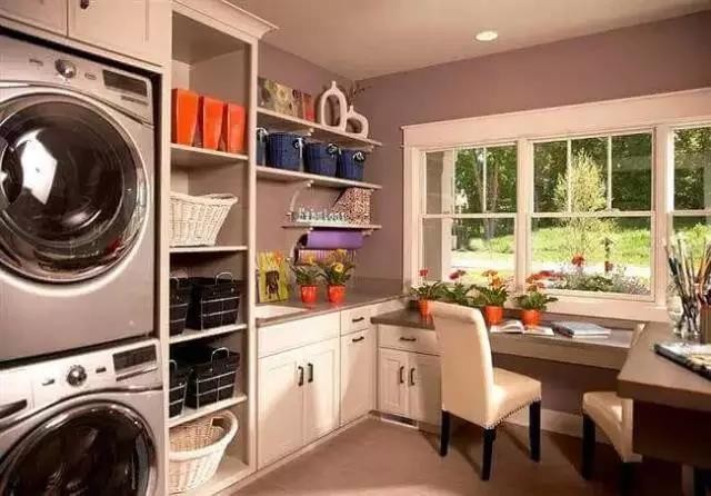 除了些大家都能想到的地方,多功能,符合人體工程學且方便的洗衣房可以配備在房子最意想不到的的角落。不過在這種情況下,洗衣房要像主臥一樣重視風格和設計。異想天開一點兒,洗衣機安裝在書房也是可以的,只要能正常進行清洗流程。清洗的地方可以很容易的與工作空間隔開,用漂亮的門、窗簾、屏風或滑動隔板都可以。