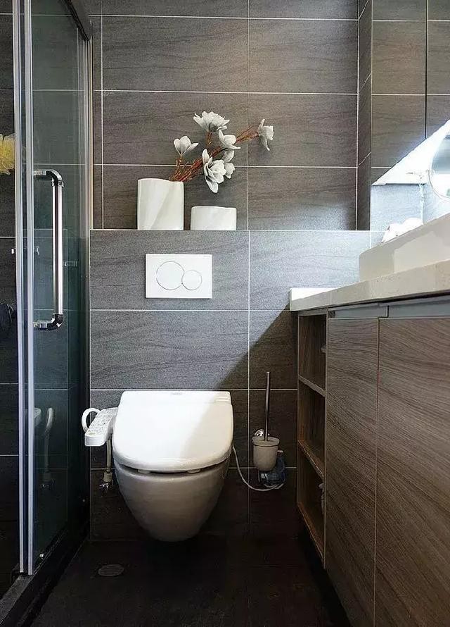 無論是坐便器還是掛墻式臺盆,預(yù)留出一些可用的空間,方便日常清潔。尤其是掛墻式臺盆,上下方利用空間都很大,可以安置合適的浴室柜。