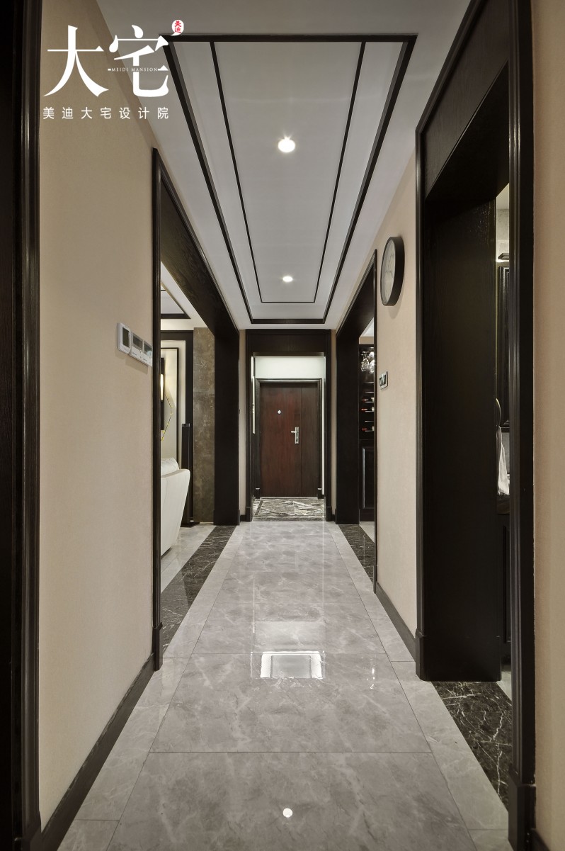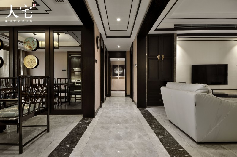 ▲一入戶門,入目的便是一對掛畫,似看是圓卻非圓;與傳統(tǒng)中式玄關(guān)不同的是,現(xiàn)代背景演繹下的新中式不再鐘情于繁瑣與沉悶,而是將傳統(tǒng)元素和現(xiàn)代元素相互融合,相得益彰,勾畫出打破傳統(tǒng)卻又不顯突兀的美感。