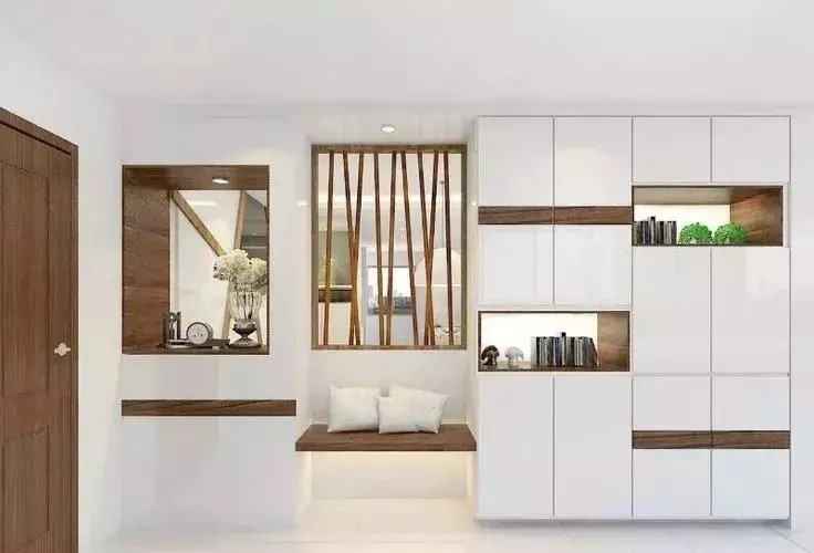 嵌入式壁柜是節(jié)省空間的利器,它的外觀簡(jiǎn)約大氣,內(nèi)部收納空間也很充足,你可以設(shè)計(jì)成半開放+半封閉的形式,讓換鞋凳和收納區(qū)融為一體,整個(gè)門廳就不會(huì)顯得又?jǐn)D又亂了。
