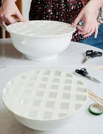 接著將花瓶或者花盆,用膠帶在口徑處用橫向和縱向的豎線(xiàn)切割成一個(gè)個(gè)小方塊的形狀。
