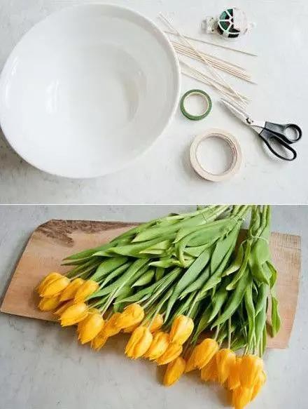 首先道具準(zhǔn)備:花瓶、膠帶、剪刀、鮮花以及竹簽