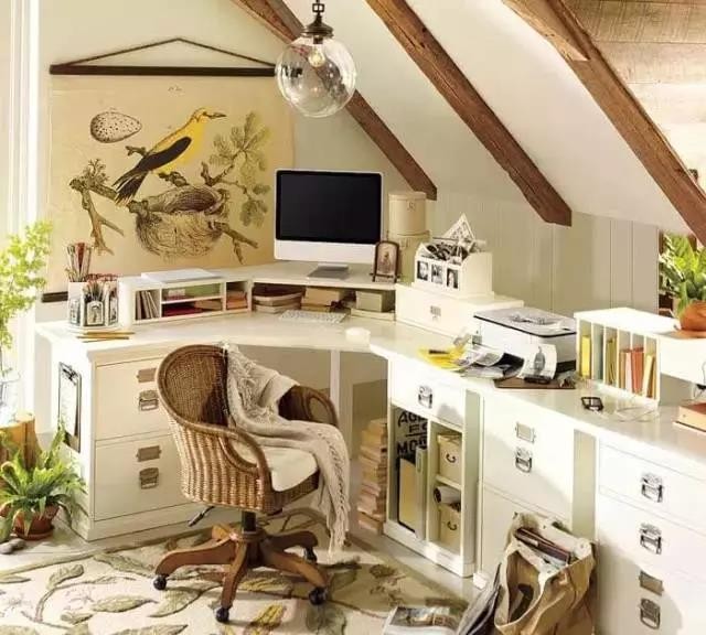 角落的空間往往被忽視,即使只有小小一塊,也足夠打造一片功能齊全的辦公空間,最好還能擁有自然光照明和良好的通風,工作累了還可以看看窗外放松一下雙眼,角落幾乎看不到什么能讓你分心的東西,還能更集中注意辦公哦!