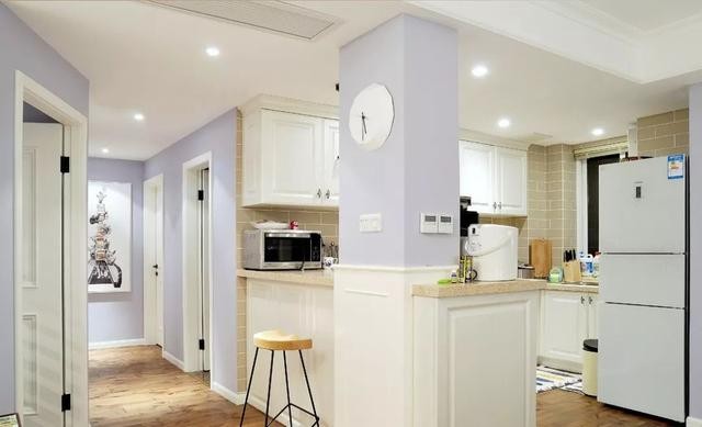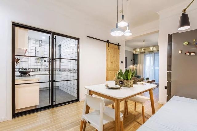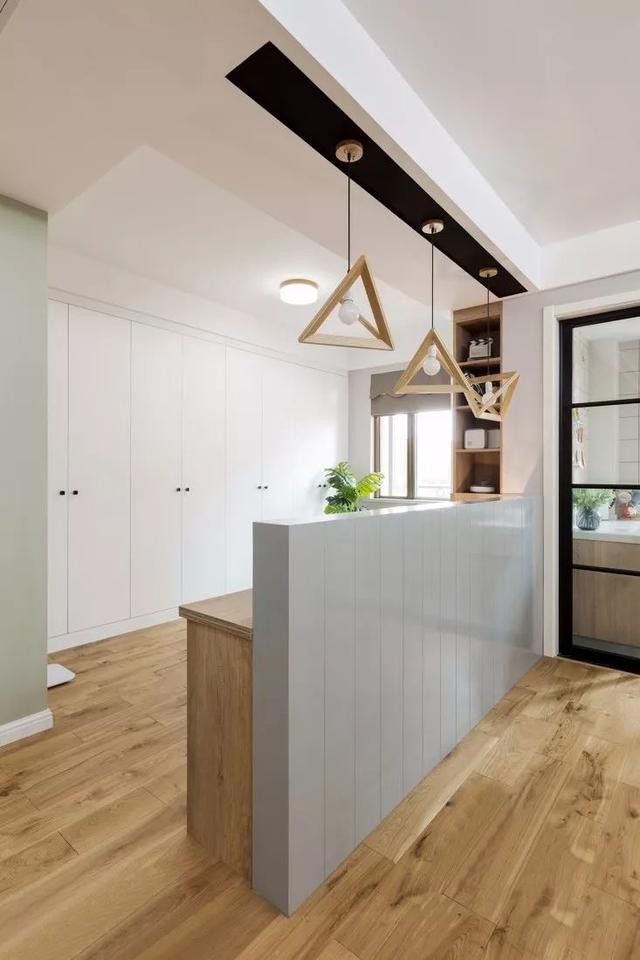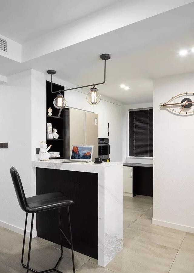 不知道廚房區(qū)域如何分割?除了推拉門之外,喜歡開放式廚房的朋友則可以選擇做個(gè)小吧臺(tái),它也可以成為用餐區(qū),這樣一來不僅貌美而且有效提高了空間利用率。