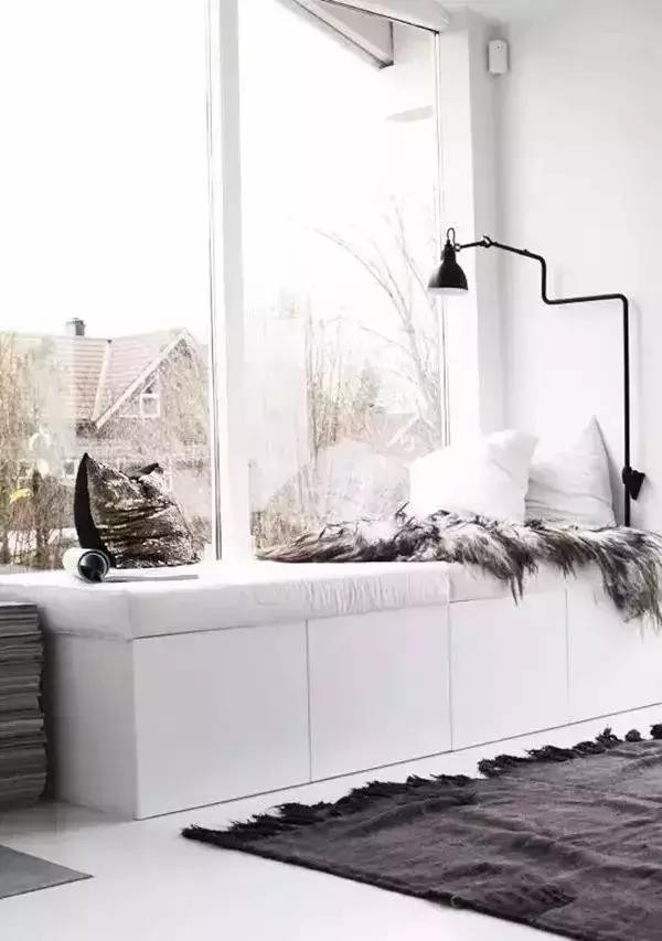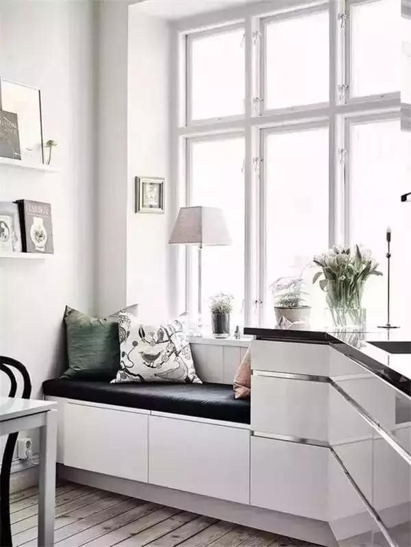 順著墻角和窗戶的線條,放置一個(gè)擱板,就能成為一個(gè)簡單的飄窗,看看書喝喝茶,不能更美好了。還可以在飄窗下面做成收納柜,美觀的同時(shí)還有滿滿的收納能力。