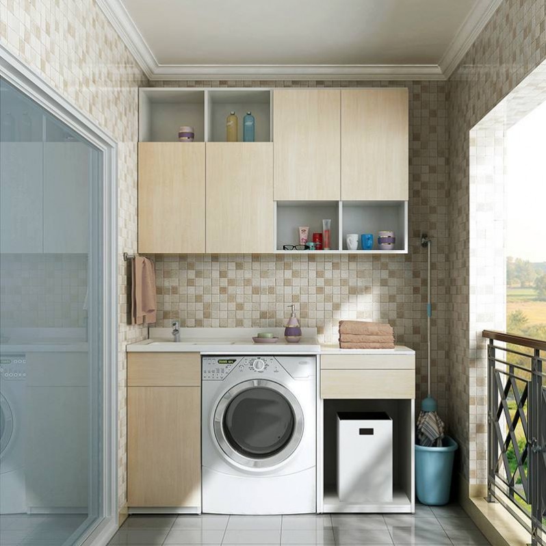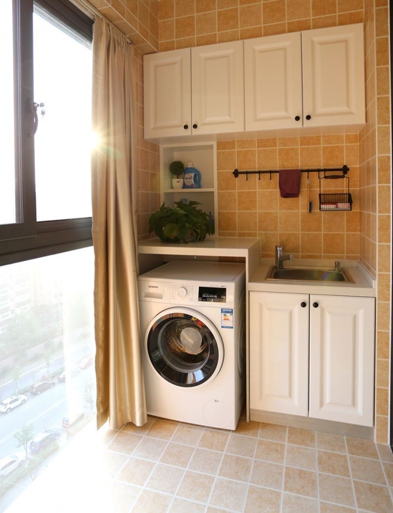 洗衣機(jī)放在陽臺是個好選擇,加個洗衣池或者洗衣柜能增加使用和儲物功能。