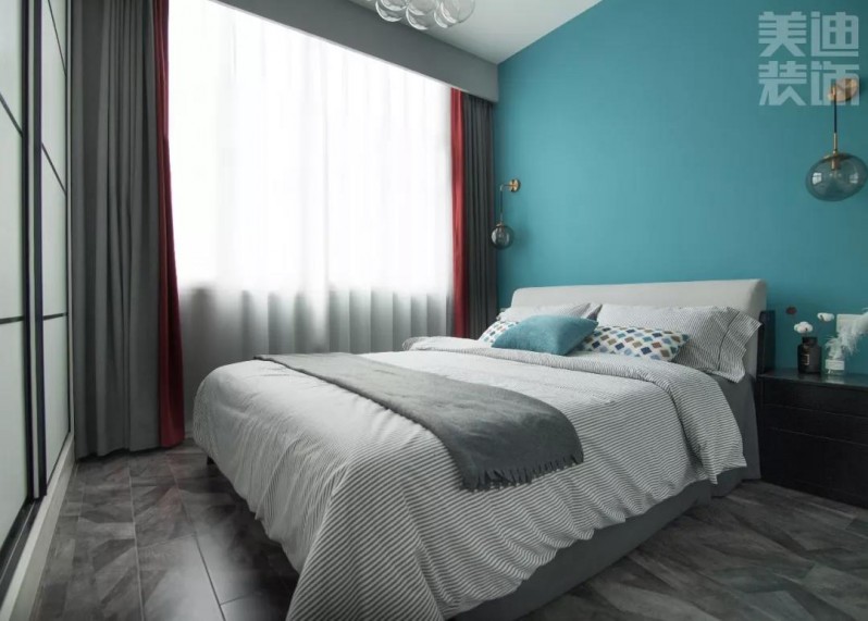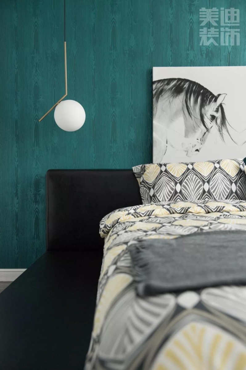 臥室背景墻依舊走性冷淡風(fēng),采用酞青綠,既展現(xiàn)出灰色的優(yōu)雅內(nèi)斂,也釋放出綠色的恬淡,營造出平和舒緩的臥室氛圍。