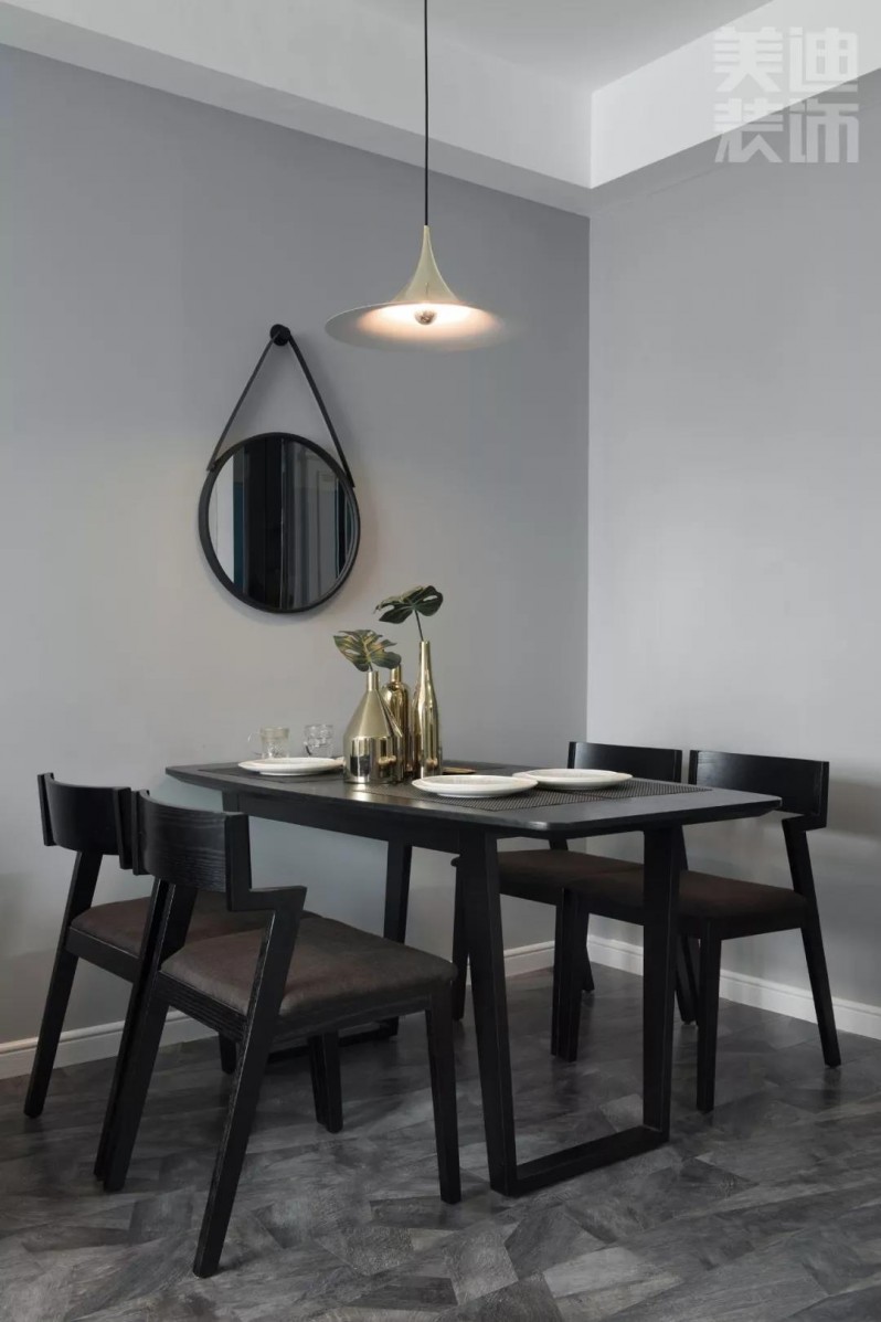黑色餐桌與客廳茶幾呼應(yīng),金屬吊燈、金屬花瓶擺件很好地點亮了餐廳空間,讓原本大面積的黑色顯得不那么沉悶。