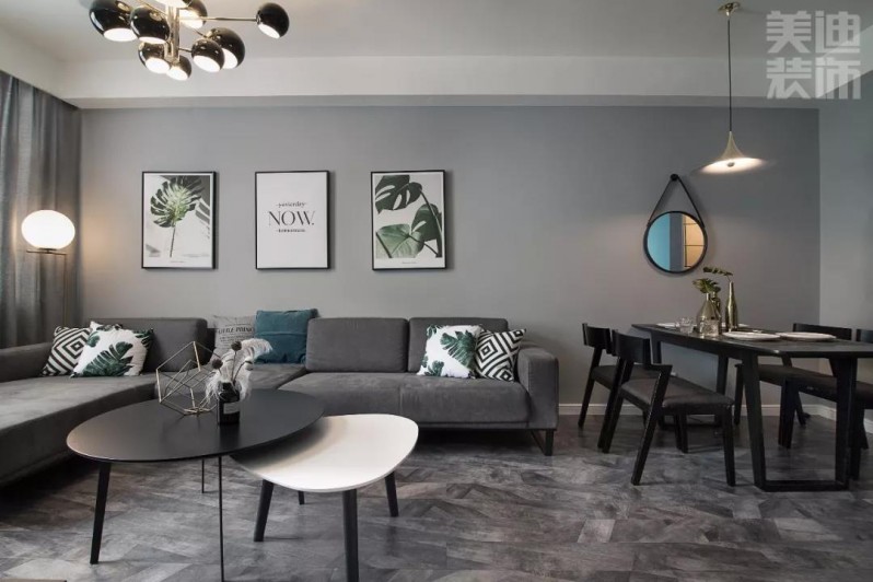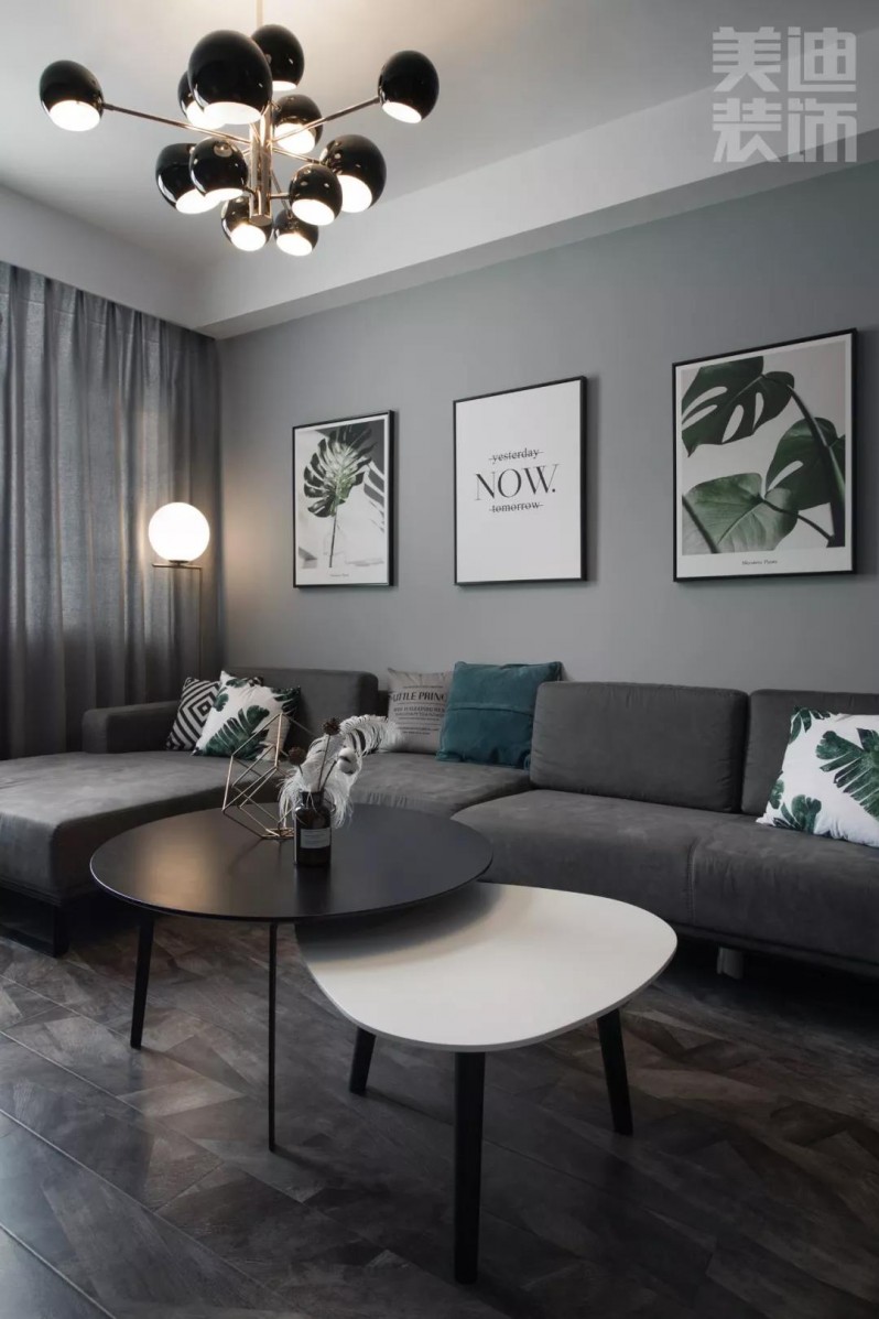客廳一定要有舒適柔軟的沙發(fā),隨時可以躺下。灰色墻面上的北歐風(fēng)綠植裝飾畫,為空間點綴一點跳躍的色彩,為整體增添一縷清新自然感。