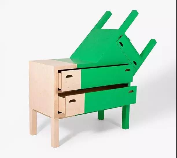 設(shè)計(jì)師將未涂色,和普通書柜一樣的部分抽屜代表“善”;而綠色部分用不規(guī)則的怪異形狀來(lái)代表“惡”的一面。
