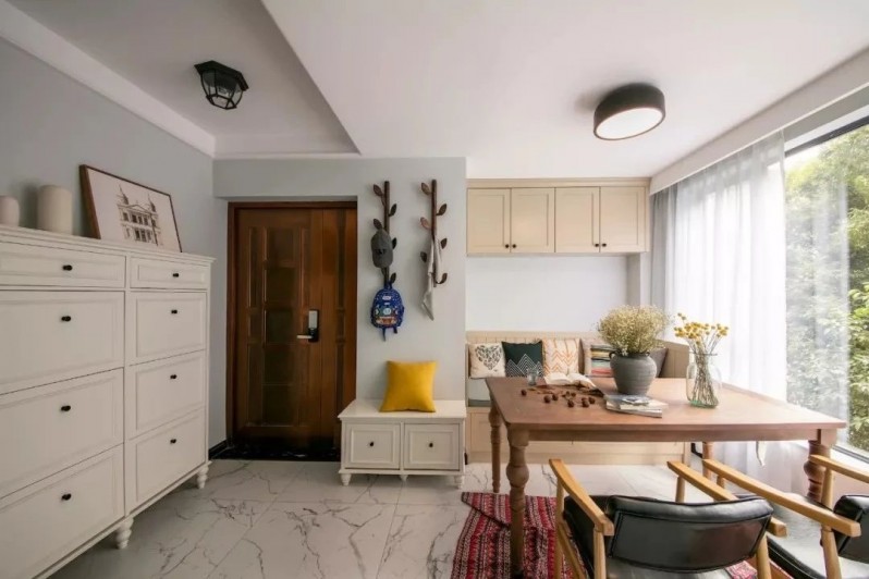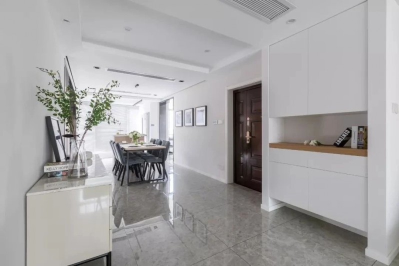進門是餐廳的戶型比較多,這種情況還比較容易處理,沿著垂直于入戶門的墻面設計鞋柜就行。如果入戶門是內(nèi)開的,盡量改個方形成外開,可以節(jié)約室內(nèi)空間。