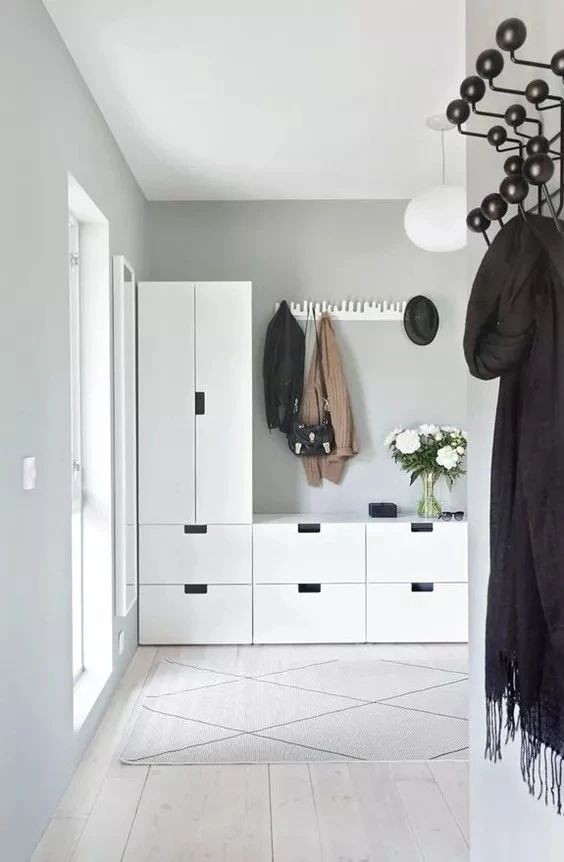 如果入戶門的位置已經(jīng)基本靠到了墻角,沒有足夠的厚度來定做鞋柜的話,可以考慮選用比較薄的成品鞋柜。
