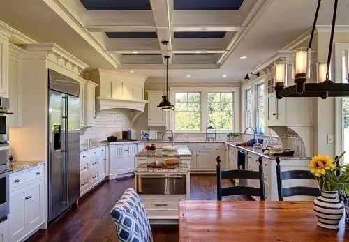 美式裝修風(fēng)格的廚房通常是開放式設(shè)計(jì),當(dāng)然,還需要一個(gè)吧臺(tái)及功能強(qiáng)大又簡單耐用的廚具設(shè)備。