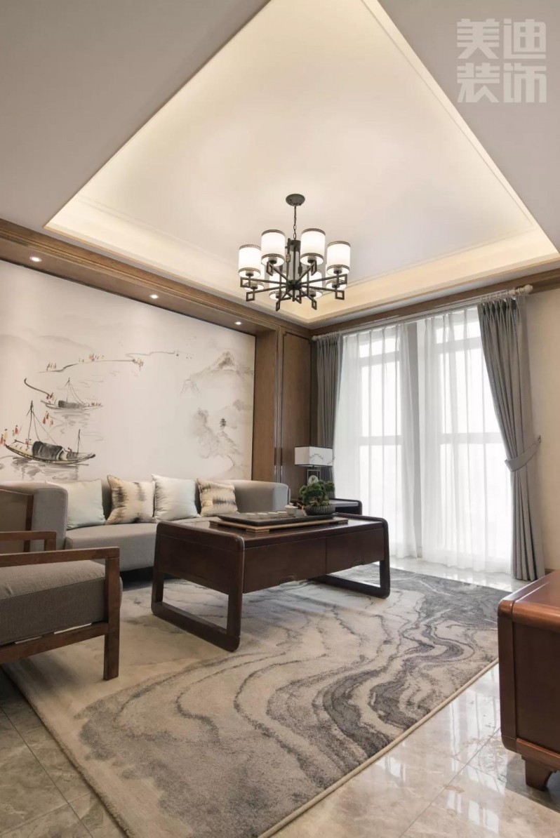 真正能夠凝聚一個文化、一個傳統(tǒng)的正是那些歷久彌新的形象,比如中國文化的山與水的形象??筒蛷d吊頂和家具布置,有方有圓,方圓對比運用到極致。