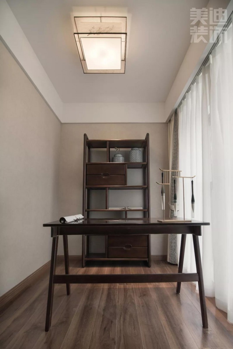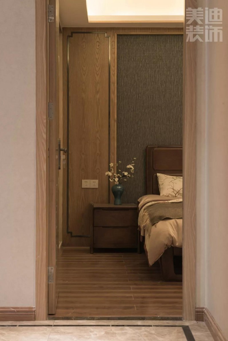 臥室整體色調(diào)以灰、褐色為主,在淡然中又有了一份成熟的韻味。設(shè)計師采用長形木地板鋪就,舒緩了空間狹促感,平添一份清雅質(zhì)感。臥室作為現(xiàn)代人重要的休憩之所,是唯一可以真正放松自己的地方,新中式風(fēng)給人一種寧靜致遠的感覺。