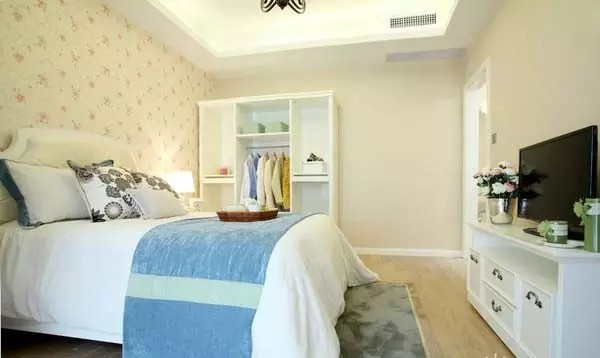 柔軟舒適的床品,淺色碎花墻紙,再搭配海藍(lán)色的地毯,將臥室陽(yáng)臺(tái)打通,光線透過(guò)落地窗投入室內(nèi),顯得更加清爽、舒適,打造完美的臥室空間。