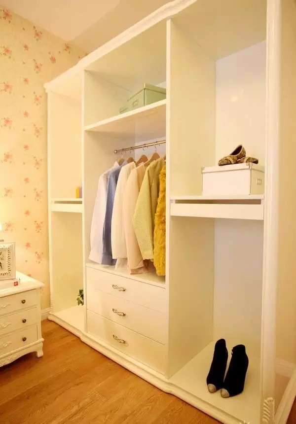 靠墻放置的簡(jiǎn)約白色衣柜,既可以收納衣物,又能展示裝飾品。