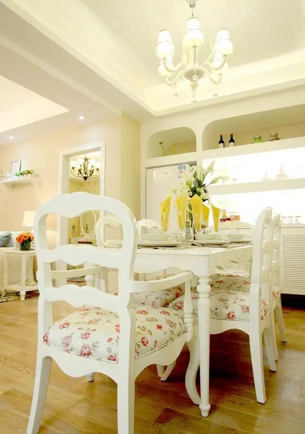 這套韓式風(fēng)格餐廳裝修既簡(jiǎn)潔,又唯美,花朵造型的吊頂,碎花元素裝點(diǎn)座椅,線條柔美的白色餐桌,感受充滿浪漫情調(diào)的韓國(guó)風(fēng)情。