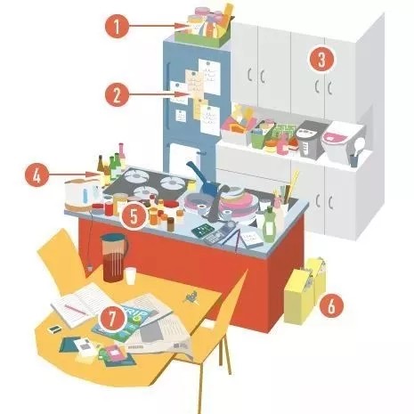 圖中是個亂糟糟的廚房和餐廳。你的廚房收納是否也有同樣的苦惱呢?