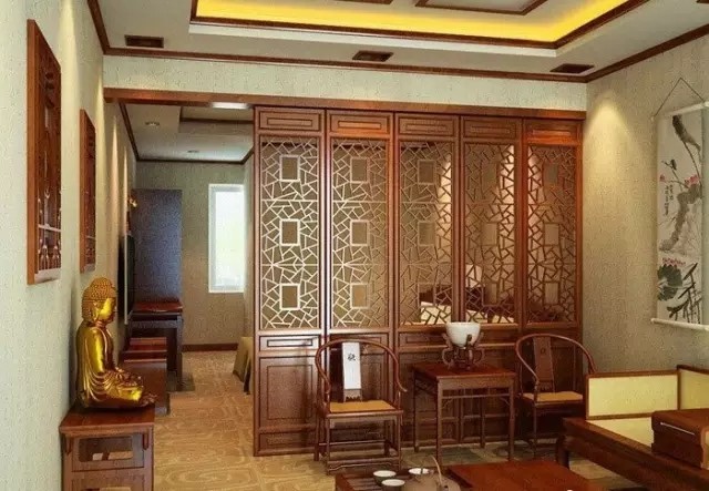 5、屏風(fēng):屏風(fēng)是中式風(fēng)格中最具代表性的裝飾元素,也是現(xiàn)代家庭中應(yīng)用得最多的元素之一。中式屏風(fēng)的制作樣式多種多樣,有擋屏、實(shí)木雕花、拼圖花板等組合而成。還有一些黑色描金屏風(fēng),并在其表面做上手工描繪花草、人物或者吉祥物等圖案,描繪的圖案色彩強(qiáng)烈、搭配分明。在現(xiàn)在的客廳和中式餐廳中都會(huì)擺放這樣的屏風(fēng),既能作為隔斷所用,又能增添室內(nèi)中式古典氣息。